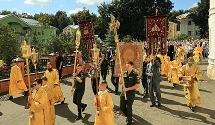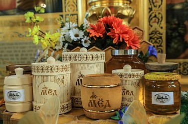 По заамвонной молитве был совершен крестный ход с иконой Всемилостивого Спаса. После чего, вернувшись в храм, было совершено поклонение Честному и Животворящему Кресту Господню и вознесена молитва ко Господу на освящение нового медового урожая.