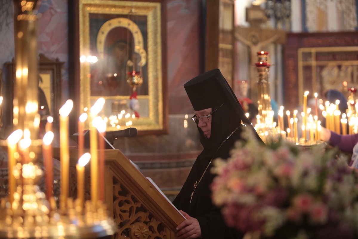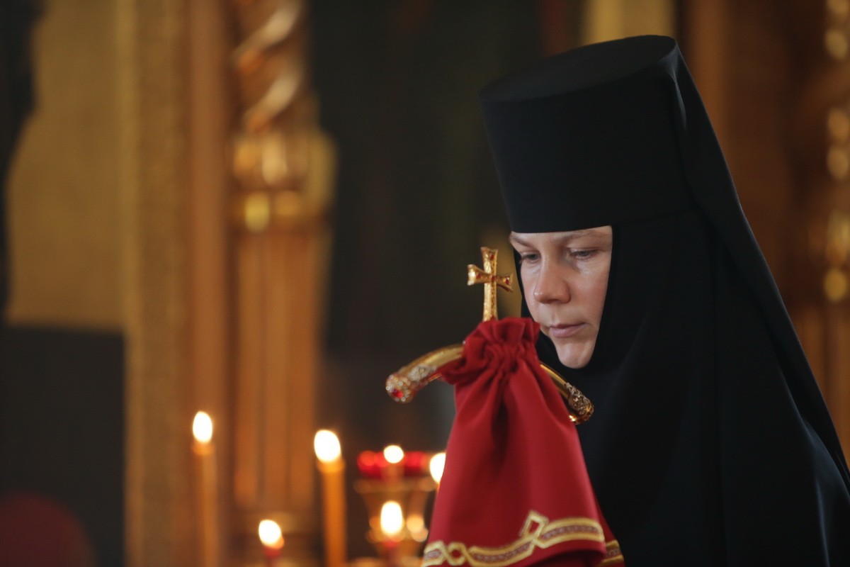 Затем митрополит Нижегородский и Арзамасский Георгий с амвона зачитал поздравительную грамоту Святейшего Патриарха Московского и всея Руси Кирилла о награждении игумении Сергии Патриаршим наперсным крестом.