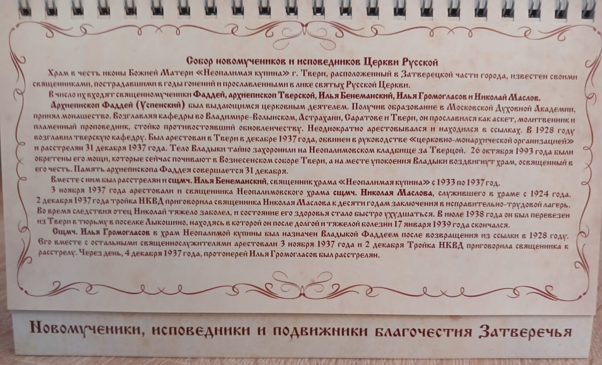 В Свято-Екатерининском женском монастыре Твери подготовили календарь с памятные датами и жизнеописаниями новомучеников, исповедников и подвижников благочестия Затверечья – старинного района города Твери.