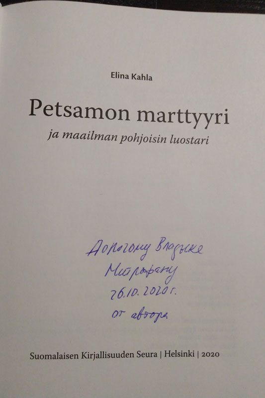 14 декабря 2020 года экземпляр книги с авторской подписью был передан через Генеральное консульство Финляндии владыке Митрофану, который лично знаком с Элиной Кахла и высоко ценит её труды.