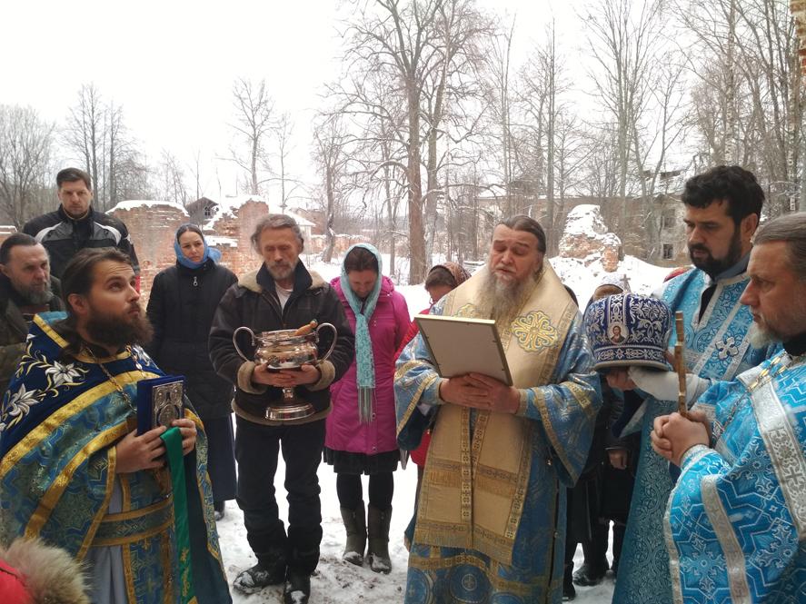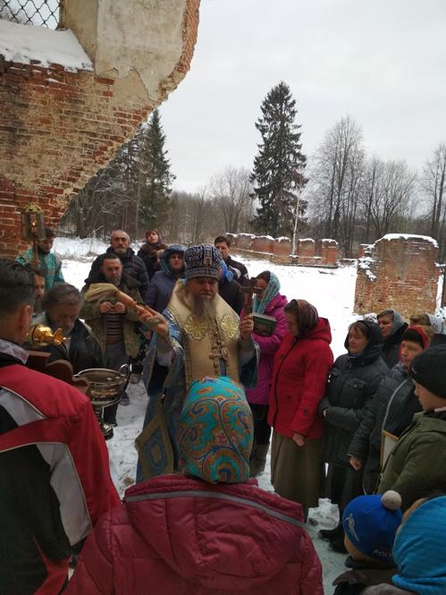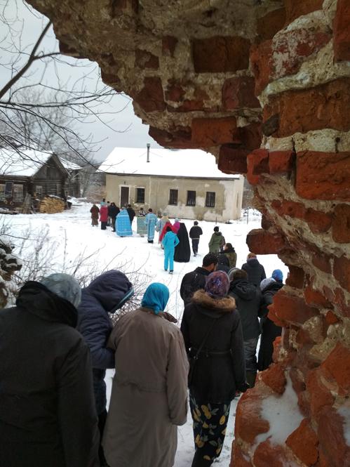 По окончании Литургии епископ Вениамин, духовенство и все молящиеся прошли крестным ходом в разрушенный храм обители, где был отслужен молебен.