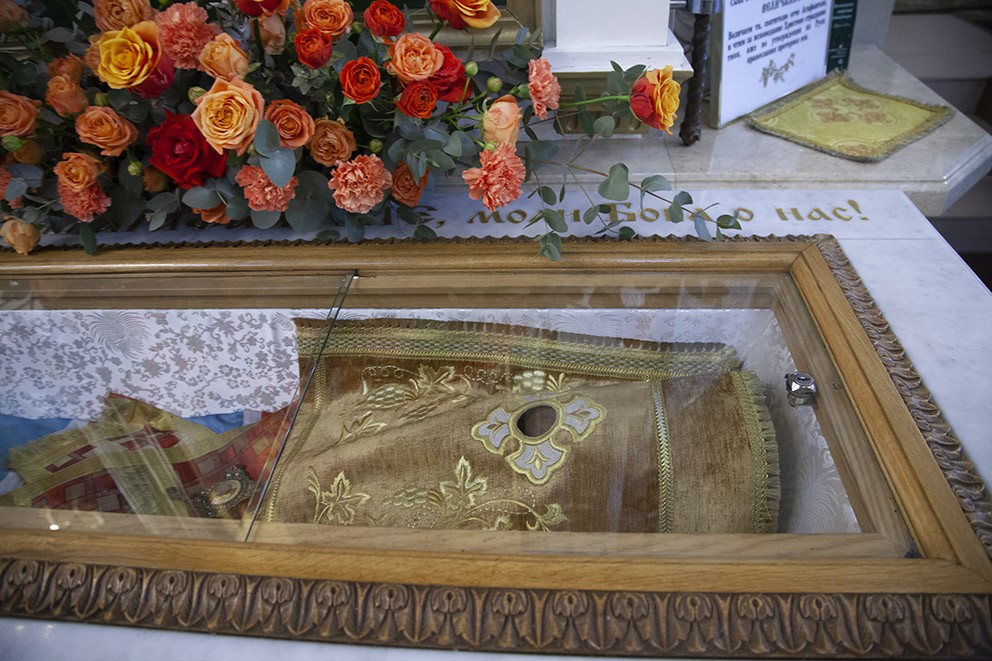 Могила находилась в склепе, устроенном в подклете храма на глубине 1,5 метра. Примечательно, что ледяные грунтовые воды, заполнявшие могилу, уничтожили почти полностью гроб, облачение, евангелие и даже панагию, но они же сохранили в целостности мощи святителя и укрыли их от предпринимавшихся ранее попыток разорения и поругания. Мощи были очищены от земли, облачены и с молитвой положены возле алтаря у левой стены Леонтьевской церкви, в подклете которой находились 70 лет.