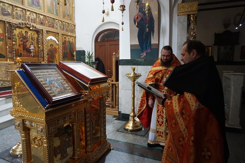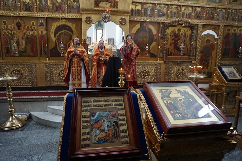 По окончании Литургии был исполнен тропарь и кондак святому Георгию Победоносцу. Иеромонах Тихон прочел молитву у ковчега с честными мощами.