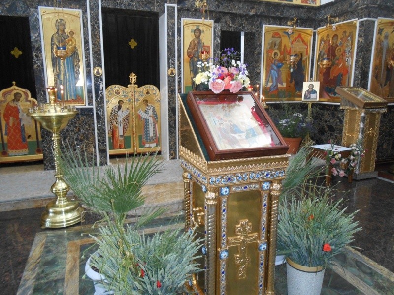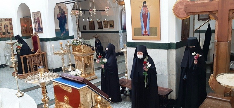 Храмы и монастырский двор были украшены цветущими растениями и колосьями пшеницы, в городе сестры выложили зеленую дорожку от ворот к храму.