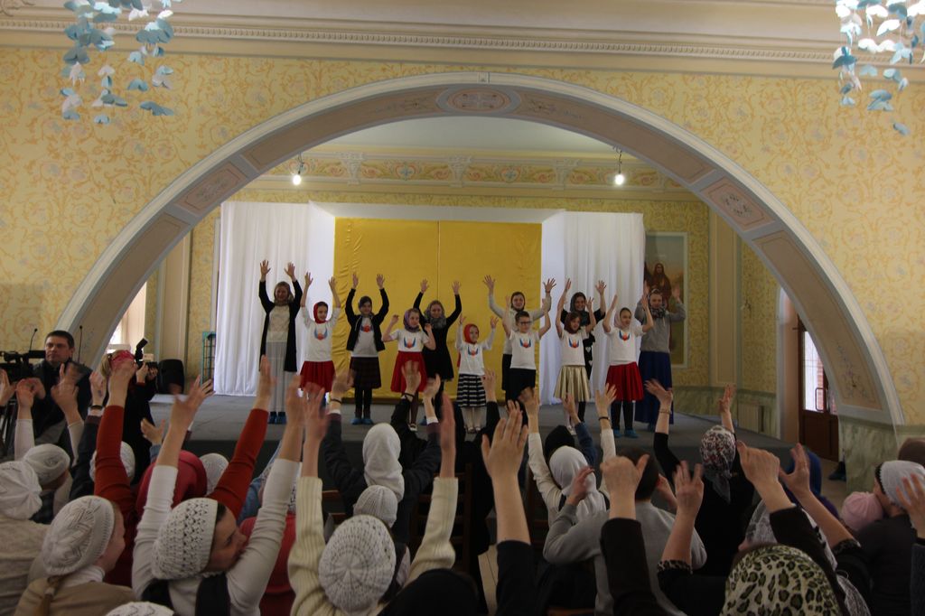 Юные артисты выступили перед сестрами, воспитанницами «Доброй школы на Сольбе» и гостями монастыря с небольшим концертом. Все слышали звукозапись песен, а дети синхронно исполняли их на языке жестов и танцевальных движений.