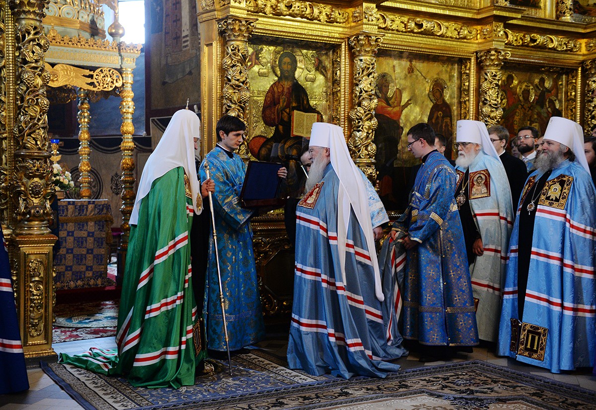 Вот почему мы так ценим Ваше участие в работе Священного Синода. Я хотел бы от всего сердца, дорогой Владыка, пожелать Вам еще долгих-долгих лет жизни, крепости сил, способности совершать Божию службу и нести все те послушания, которые на Вас возлагаются Церковью. А в память о замечательном событии, связанном с Вашей жизнью, хотел бы преподнести Вам две панагии и крест. Пусть Господь по молитвам Его Пречистой Матери, Которую Вы так почитаете и Которая пребывает здесь Своим чудотворным образом, хранит Вас на многая и благая лета!»