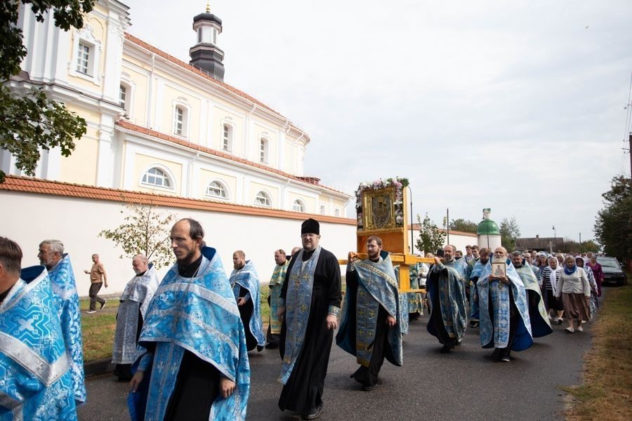 За городом паломники сели в автобусы и проследовали до агрогородка Юровичи, где продолжили торжественное шествие с чудотворной иконой к Рождество-Богородичному монастырю. Местные жители встречали образ Божией Матери, многие из них присоединялись к числу паломников, следовавших в святую обитель.