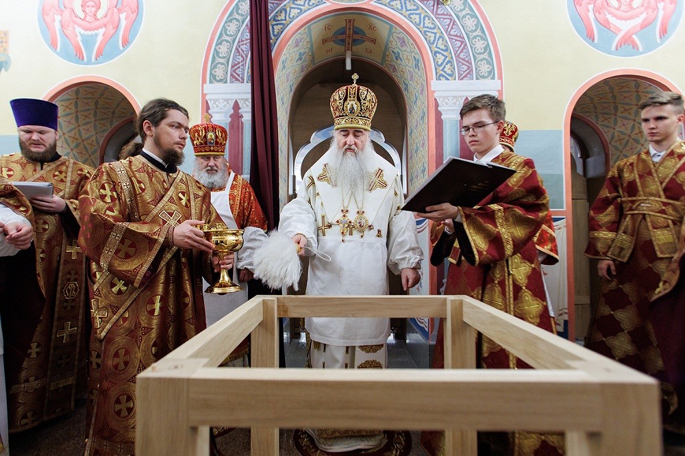 Затем архипастыри совершили первую Божественную литургию в освященном храме.