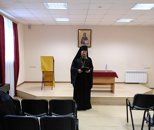 Затем председатель секции, секретарь Муромской епархии по монастырям, наместник Спасо-Преображенского мужского монастыря г. Мурома иеромонах Симеон (Нестеров) произнес приветственное слово.