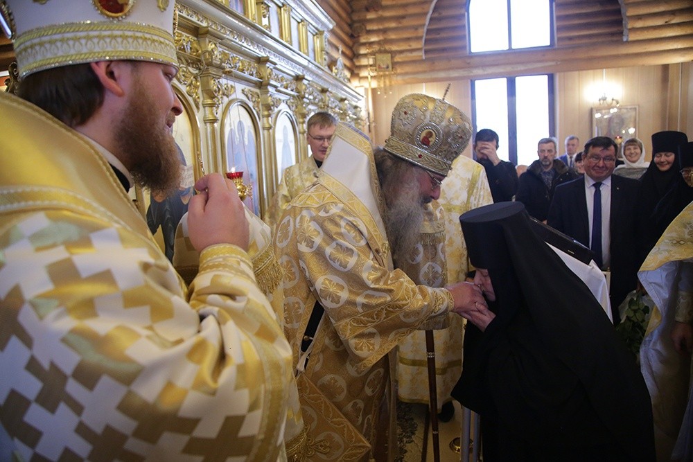 Владыка также выразил благодарность за возможность нахождения в Туринске, одном из самых древних городов Урала и Сибири. На память о совместном богослужении митрополит Кирилл подарил матушке игумении книгу о праведном Симеоне Верхотурском, преподобном Василиске Туринском и священномученике Константине Меркушинском, изданную в 2020 году. Женской обители владыка преподнес в дар благословенный образ Спасителя из святого града Иерусалима, освященный на Гробе Господнем в ноябре 2019 года.