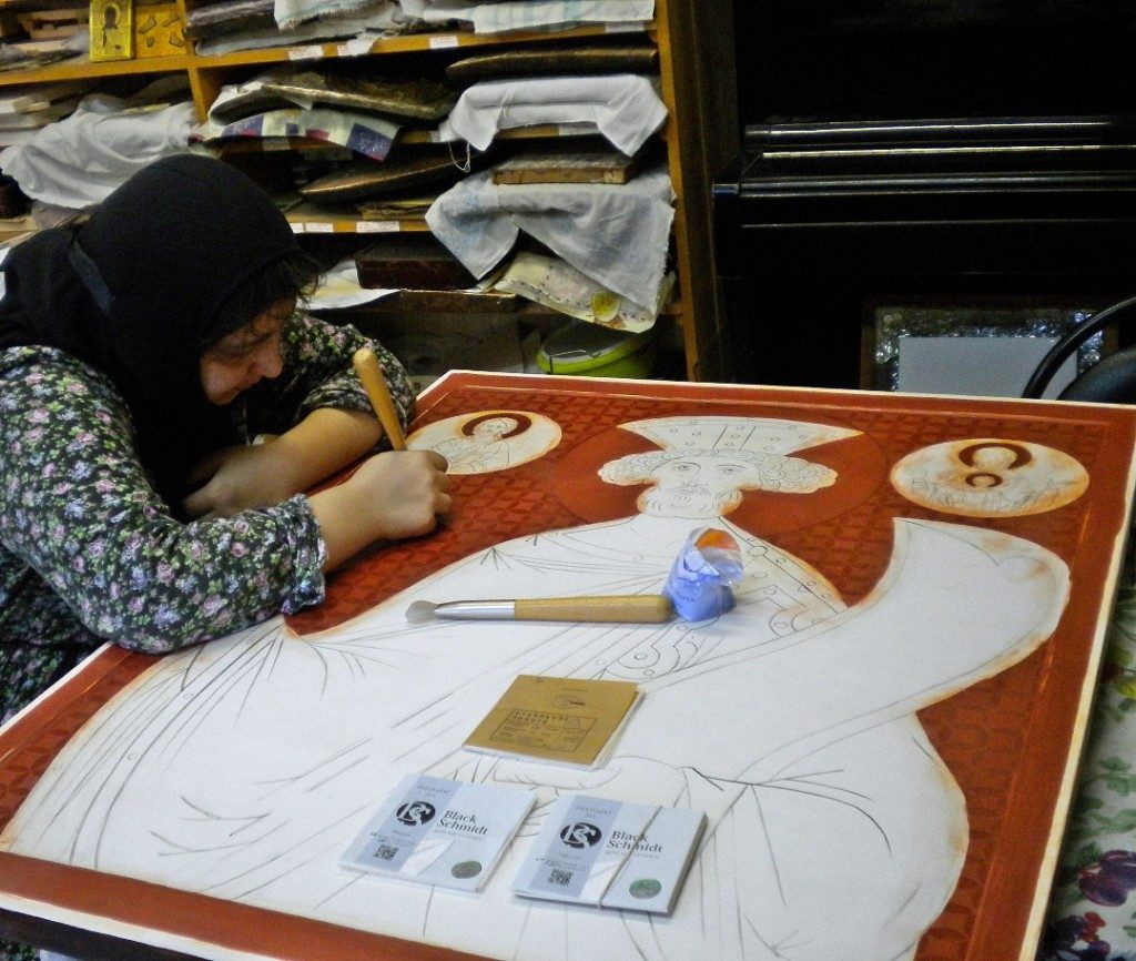 В настоящее время сестры дописывают большую икону Псалмопевца с орнаментом на золотом фоне.