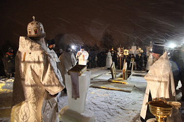 По окончании Литургии владыка, священнослужители, насельницы обители и паломники прошли крестным ходом от храма к реке Волге, где Его Высокопреосвященство совершил чин великого освящения вод.