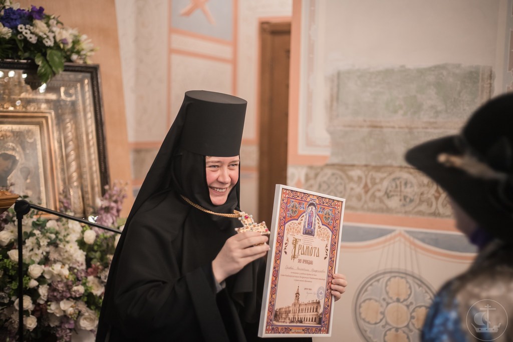 В завершение торжества со словами признательности всем, кто трудился и продолжает помогать обители, обратилась и вручила благодарственные письма настоятельница монастыря игумения София (Силина).