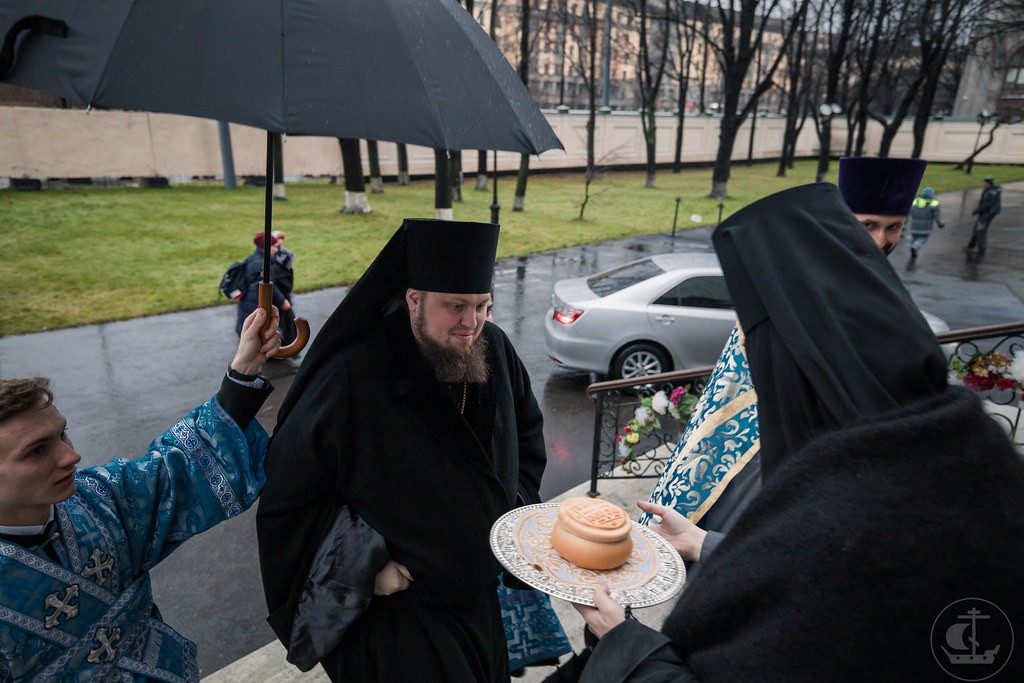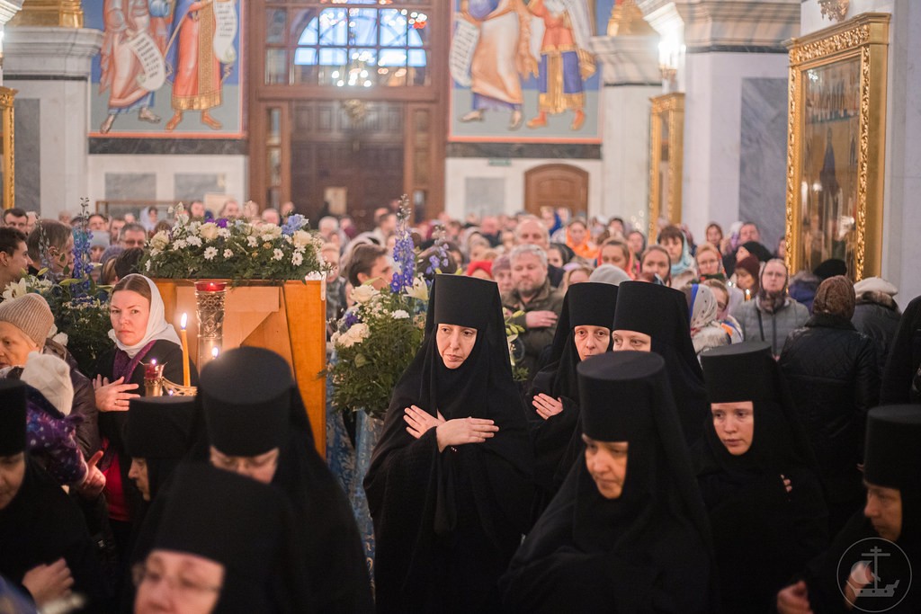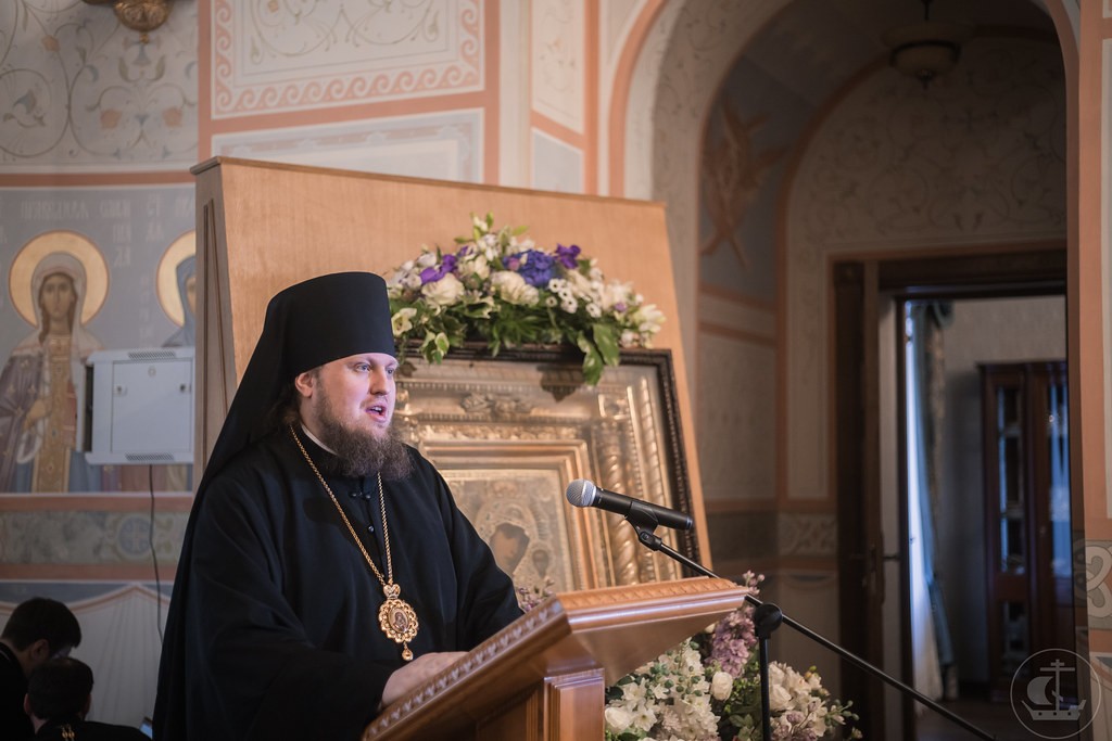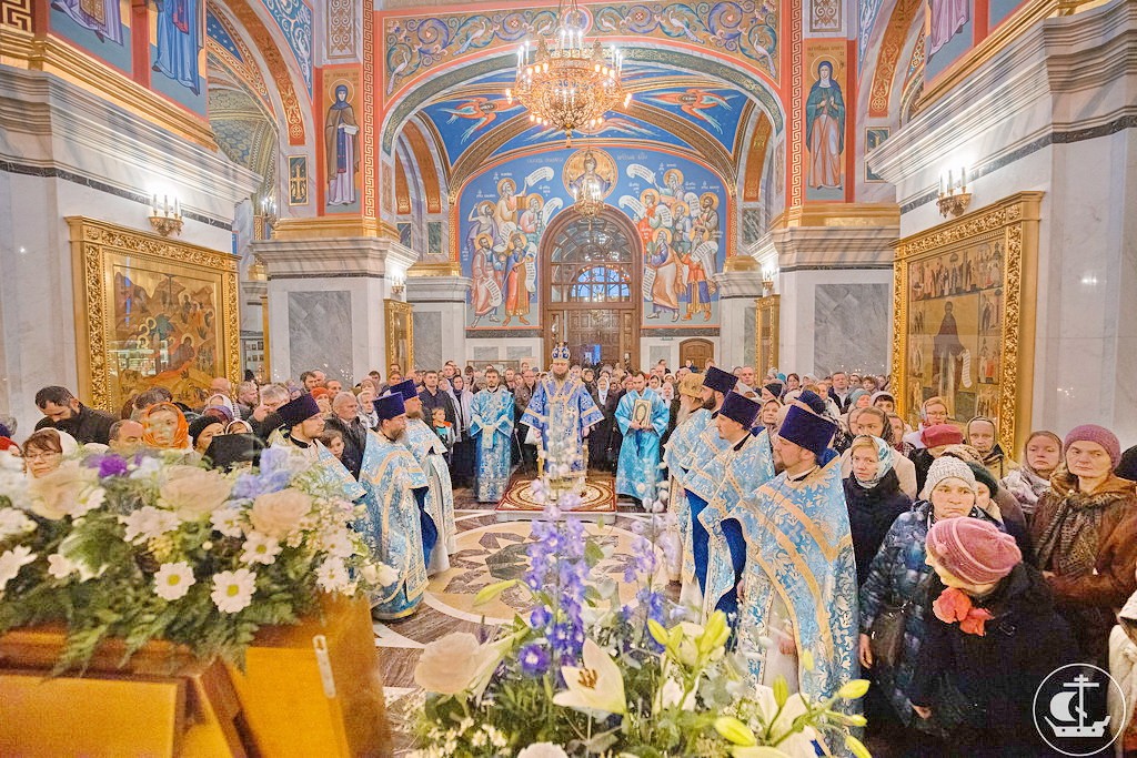 Его Преосвященству сослужили: первый проректор заслуженный профессор СПбДАиС протоиерей Василий Стойков, настоятель Князь-Владимирского собора протоиерей Владимир Сорокин, настоятель храма Благовещения Пресвятой Богородицы на Васильевском острове протоиерей Андрей Дьяконов, старший священник Новодевичьего монастыря иерей Дионисий Харин и духовенство обители.