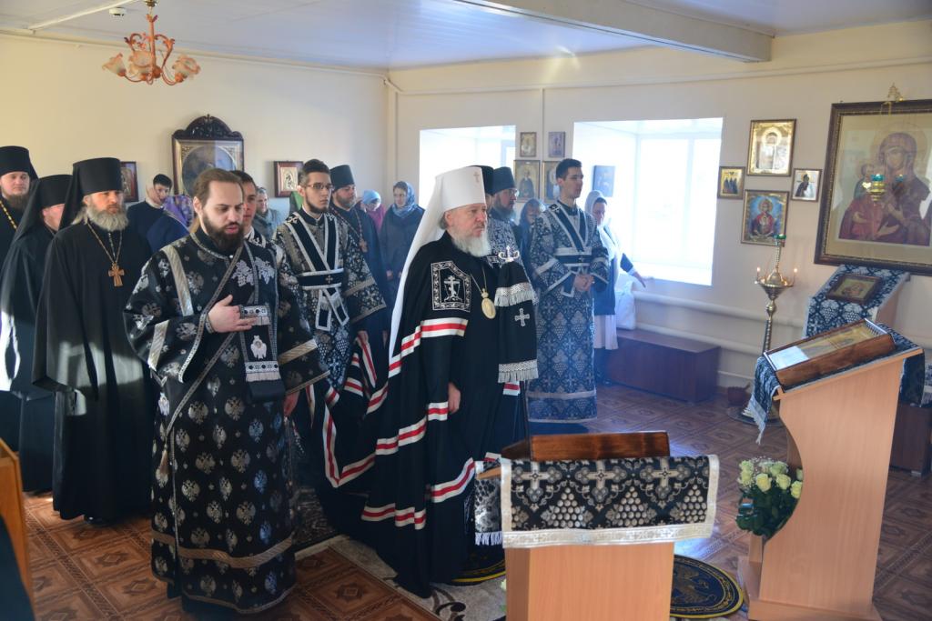 Его Высокопреосвященству сослужили благочинный монастырей Брянской епархии игумен Даниил (Цупиков), наместник Свенского Успенского монастыря игумен Алексий (Тюрин), настоятель Бело-Бережской Иоанно-Предтеченской пустыни игумен Глеб (Шматов), настоятель Богородицкой Площанской пустыни игумен Леонид (Лушкин), и.о. настоятеля Карачевского Воскресенского монастыря иеромонах Алексий (Долгачев), насельник Богородицкой Площанской пустыни иеромонах Иоанн (Скабара).