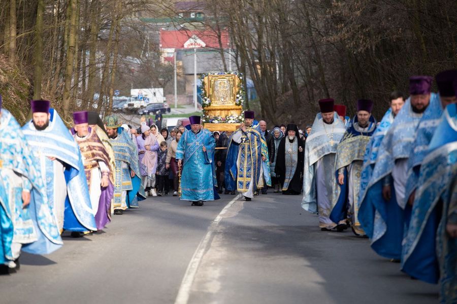 По окончании Литургии духовенство, монашествующие и паломники под звон колоколов прошли крестным ходом вокруг собора с иконой Божией Матери «Юровичская-Милосердная», по окончании которого было совершено славление Пресвятой Богородице.