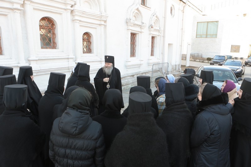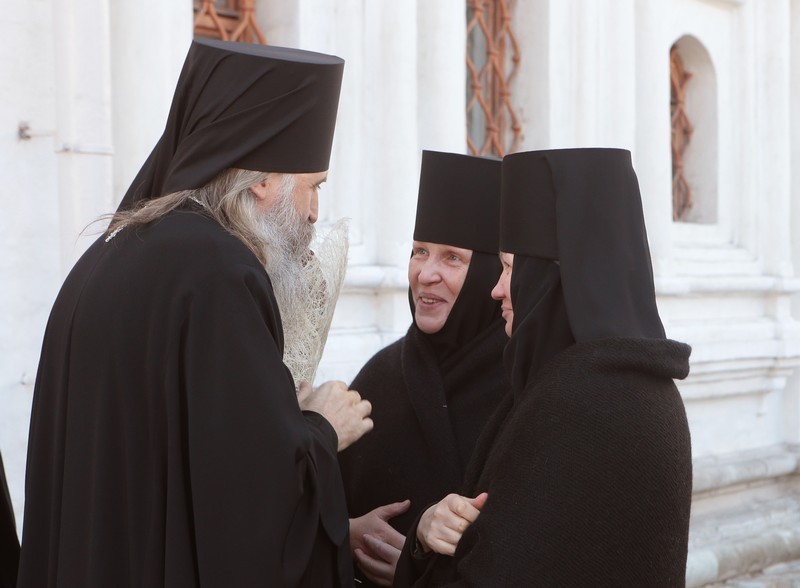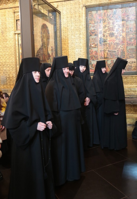 За Литургией молились: Заместитель Председателя Синодального отдела по монастырям и монашеству, настоятельница Зачатьевского ставропигиального женского монастыря игумения Иулиания (Каледа) с сестрами; наместник Заиконоспасского ставропигиального мужского монастыря архимандрит Петр (Афанасьев); настоятельница Богородице-Рождественского ставропигиального женского монастыря игумения Викторина (Перминова) с сестрами.