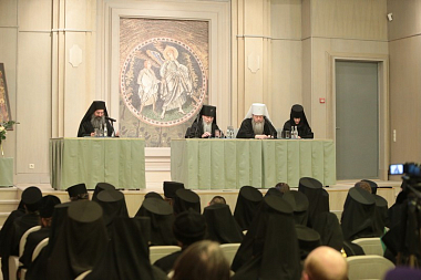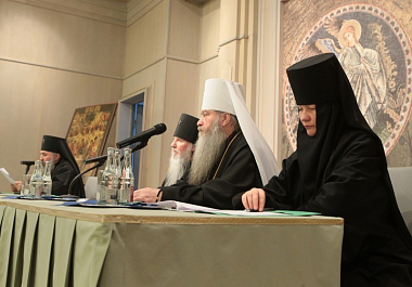 В Президиуме находились митрополит Новосибирский и Бердский Тихон и куратор данного заседания игумения Иулиания (Каледа), заместитель председателя Отдела, настоятельница московского Зачатьевского ставропигиального монастыря.