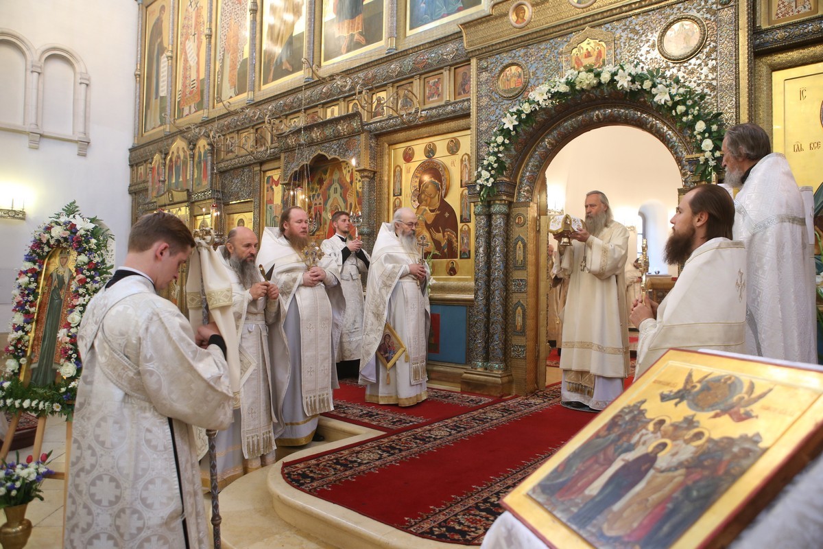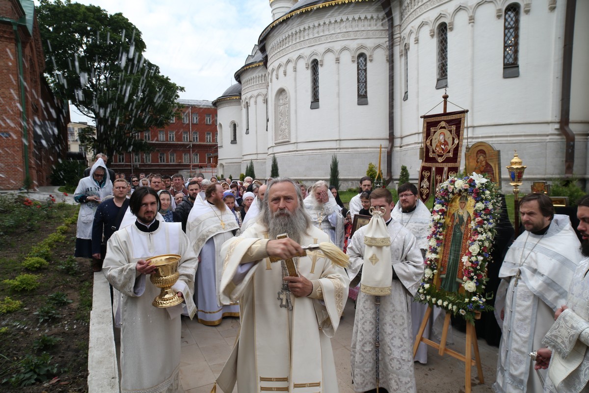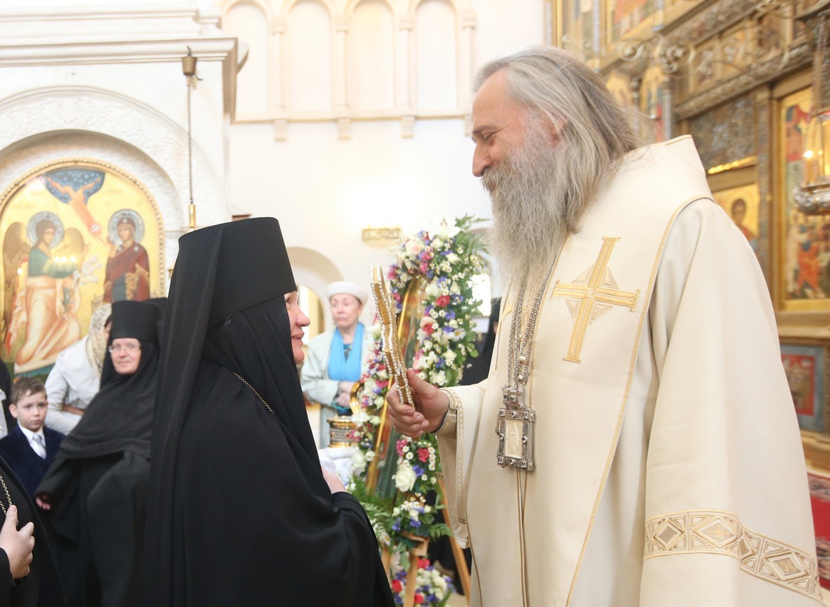 В этот день праздничную Божественную литургию в монастырском соборе Рождества Пресвятой Богородицы возглавил председатель Синодального отдела по монастырям и монашеству архиепископ Сергиево-Посадский Феогност.
