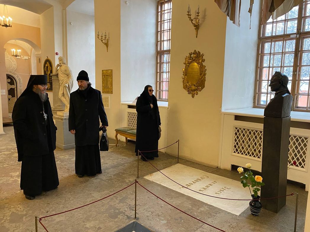 Посещение обители было начато с поклонения мощам её небесного покровителя – святого благоверного князя Александра Невского. После встречи епископ Назарий благословил сопровождать членов Коллегии директору детской воскресной школы Александро-Невской лавры иеромонаху Димитрию (Самойлову). Вместе с ним были осмотрены храмы обители (храм в честь святого благоверного князя Феодора Новгородского, Благовещенская церковь, где находится могила генералиссимуса А.В. Суворова).