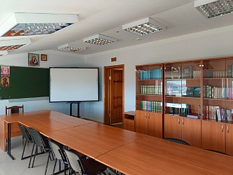 На дополнительной учебной площадке, в Центре подготовки церковных специалистов при кафедральном соборе Святой Живоначальной Троицы, члены комиссии проверили библиотечный фонд и материально-техническое обеспечение курсов.