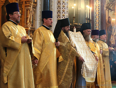 На сугубой ектении были возглашены прошения о тезоименитом Святейшем Патриархе Кирилле. Митрополит Крутицкий и Коломенский Ювеналий прочитал благодарственную молитву.