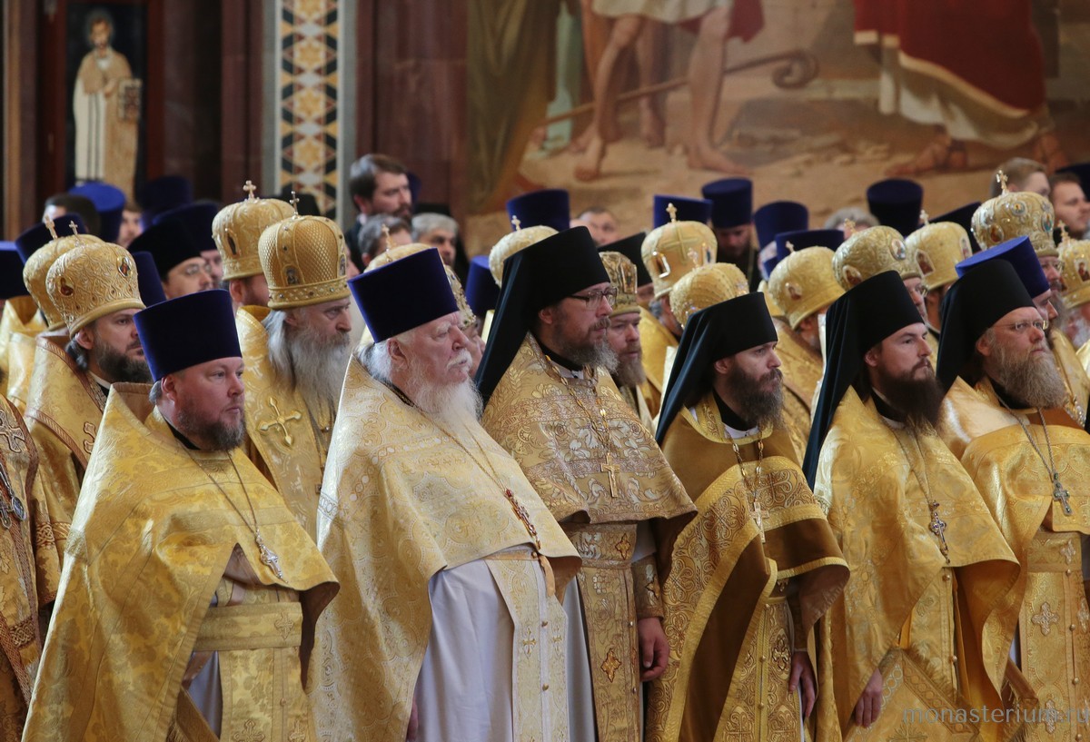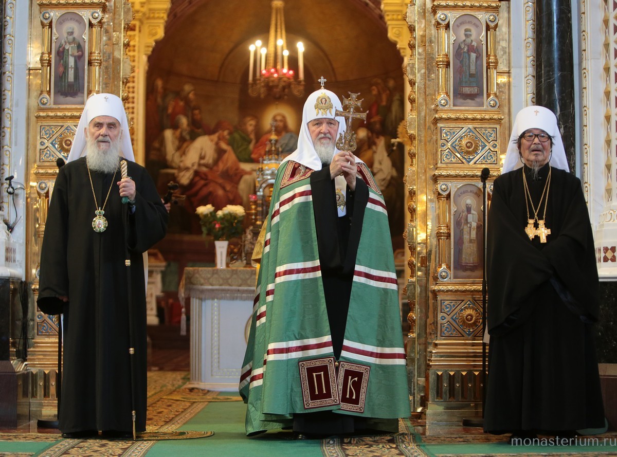 За Литургией Святейшему Патриарху Кириллу и Святейшему Патриарху Иринею сослужили: митрополит Токийский и всей Японии Даниил; митрополит Крутицкий и Коломенский Ювеналий, Патриарший наместник Московской епархии; митрополит Ташкентский и Узбекистанский Викентий, глава Среднеазиатского митрополичьего округа; митрополит Санкт-Петербургский и Ладожский Варсонофий, управляющий делами Московской Патриархии; митрополит Минский и Заславский Павел, Патриарший экзарх всея Беларуси; митрополит Волоколамский Иларион, председатель Отдела внешних церковных связей Московского Патриархата; митрополит Валентин (Мищук); митрополит Калужский и Боровский Климент, председатель Издательского Совета Русской Православной Церкви; митрополит Воронежский и Лискинский Сергий; митрополит Ярославский и Ростовский Пантелеимон;митрополит Истринский Арсений, первый викарий Патриарха Московского и всея Руси по г. Москве; митрополит Владимирский и Суздальский Евлогий; митрополит Курский и Рыльский Герман; митрополит Екатеринбургский и Верхотурский Кирилл; митрополит Иваново-Вознесенский и Вичугский Иосиф; митрополит Ростовский и Новочеркасский Меркурий, председатель Синодального отдела религиозного образования и катехизации; митрополит Тамбовский и Рассказовский Феодосий; митрополит Нижегородский и Арзамасский Георгий; митрополит Рязанский и Михайловский Марк, председатель Финансово-хозяйственного управленияМосковского Патриархата; митрополит Бориспольский и Броварской Антоний, управляющий делами Украинской Православной Церкви; митрополит Саранский и Мордовский Зиновий; митрополит Ханты-Мансийский и Сургутский Павел; митрополит Вологодский и Кирилловский Игнатий; митрополит Хабаровский и Приамурский Владимир; митрополит Смоленский и Дорогобужский Исидор; митрополит Псковский и Порховский Тихон, председатель Патриаршего совета по культуре; архиепископ Верейский Евгений, председатель Учебного комитета Русской Православной Церкви, ректор Московской духовной академии и семинарии; архиепископ Сендайский Серафим; архиепископ Сергиево-Посадский Феогност, председатель Синодального отдела по монастырям и монашеству; архиепископ Петергофский Амвросий, ректор Санкт-Петербургской духовной академии; архиепископ Солнечногорский Сергий, руководитель Административного секретариата Московской Патриархии; собор иерархов Русской Православной Церкви.