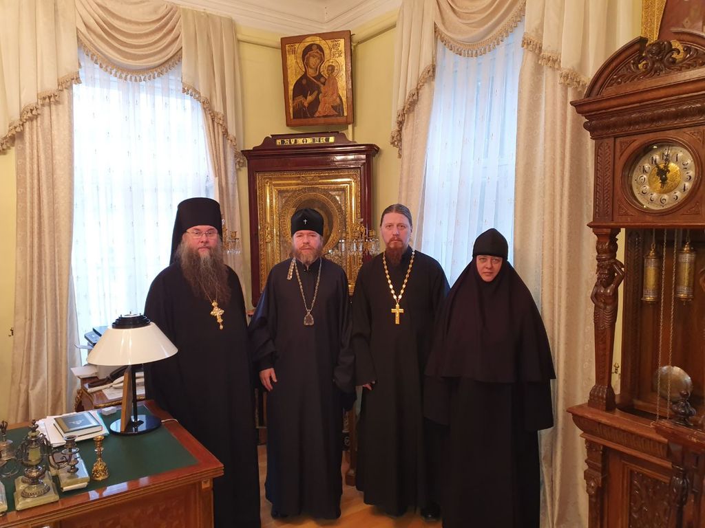 На базовой учебной площадке в Свято-Успенском Псково-Печерском мужском монастыре состоялась встреча комиссии и руководителя курсов протоиерея Романа Ледина с игуменом монастыря, управляющим Псковской епархией митрополитом Псковским и Порховским Тихоном.