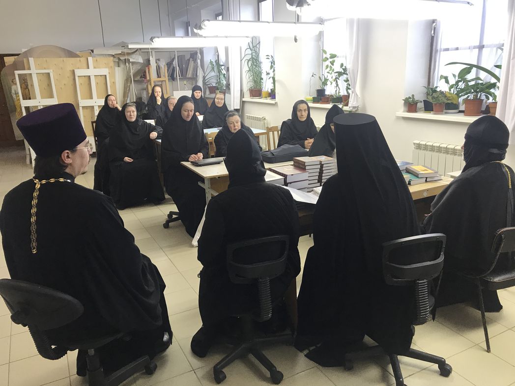 На следующий день, 28 мая, в иконописном классе Покрово-Тервенического женского монастыря члены выездной группы провели беседу с будущими слушательницами курсов. Во встрече приняли участие также настоятельница обители игумения Лукиана (Рысева) и преподаватель – священник Роман Васильевич Соколов.