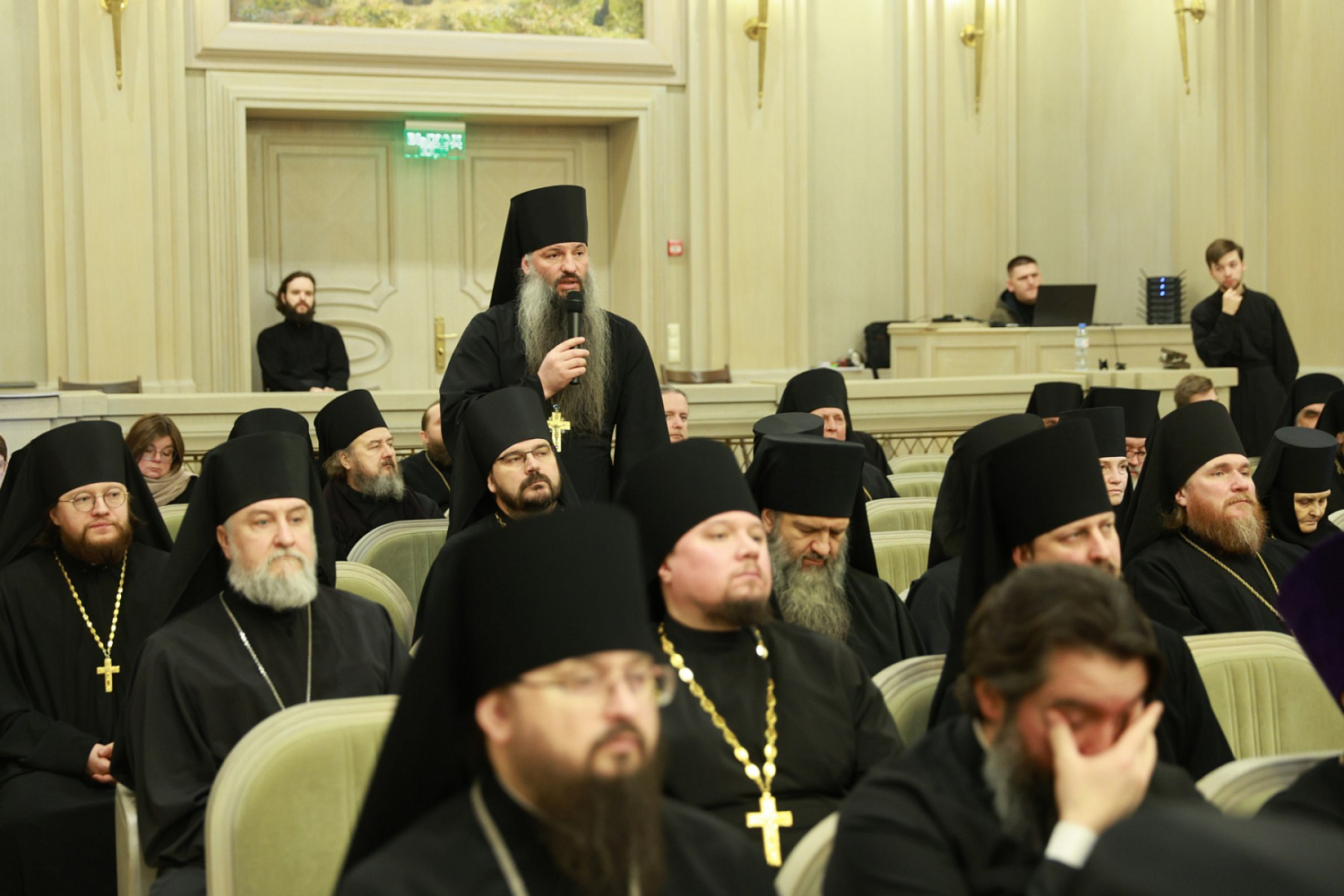 В Президиуме Собрания в зале Сретенской духовной академии присутствовали: митрополит Каширский Феогност, председатель Синодального отдела по монастырям и монашеству, наместник Донского ставропигиального мужского монастыря; митрополит Нижегородский и Арзамасский Георгий, председатель Комиссии по организации жизни монастырей и монашества Межсоборного присутствия Русской Православной Церкви; архимандрит Стефан (Тараканов), заместитель председателя СОММ, наместник Саввино-Сторожевского ставропигиального мужского монастыря; игумения Иулиания (Каледа), заместитель председателя СОММ, настоятельница Зачатьевского ставропигиального женского монастыря.