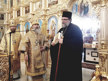 Его Высокопреосвященству сослужили: епископ Можайский Леонид, наместник Введенского ставропигиального мужского монастыря Оптина пустынь; епископ Лидский и Сморгонский Порфирий, председатель Синодального отдела по делам монастырей Белорусского экзархата; епископ Солнечногорский Алексий, наместник Данилова ставропигиального мужского монастыря Москвы; епископ Сызранский и Шигонский Леонтий; архимандрит Серафим (Гавриков), клирик Тамассоской и Оринийской митрополии Кипрской Православной Церкви, исповедующий священник в женском монастыре святого Иоанна Богослова; архимандрит Лазарь (Терещенко), руководитель Информационно-просветительского отдела Свято-Успенской Святогорской лавры; протоиерей Андрей Алешин, клирик храма Андрея Первозванного и Всех русских святых Тамасосской и Оринийской митрополии.