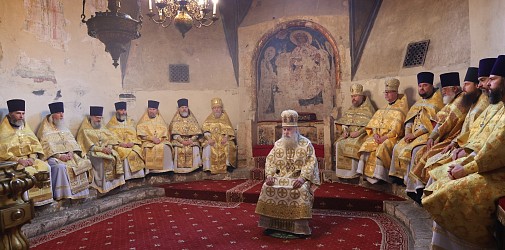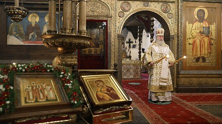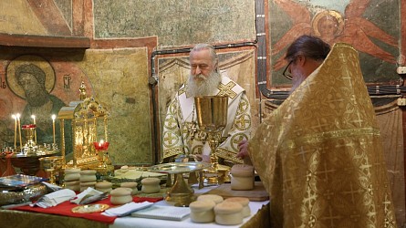 По окончании Литургии было совершено славление святителям Московским. Затем митрополит Феогност поклонился честным мощам святителей Московских, почивающих в Успенском соборе.