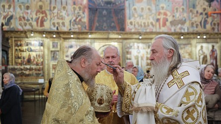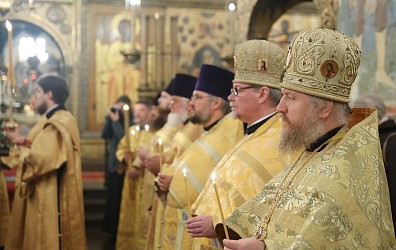 Его Высокопреосвященству сослужили наместник Саввино-Сторожевского ставропигиального мужского монастыря архимандрит Павел (Кривоногов), ризничий Патриаршего Успенского собора и храмов Московского Кремля, настоятель Патриаршего подворья храмов в Зарядье г. Москвы протоиерей Вячеслав Шестаков, благочинные и клирики Москвы.