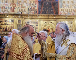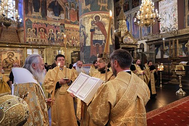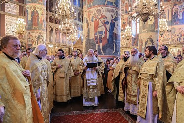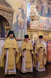 Его Высокопреосвященству сослужили секретарь Патриарха Московского и всея Руси по Москве протопресвитер Владимир Диваков, ризничий Патриаршего Успенского собора и храмов Московского Кремля, настоятель Патриаршего подворья храмов в Зарядье г. Москвы протоиерей Вячеслав Шестаков, духовенство города Москвы.
