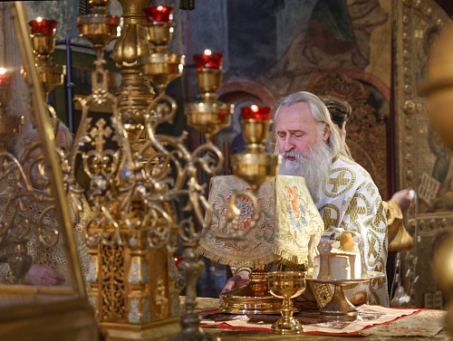 Его Высокопреосвященству сослужили: секретарь Патриарха Московского и всея Руси по г. Москве протопресвитер Владимир Диваков, ризничий Патриаршего Успенского собора и храмов Московского Кремля, настоятель Патриаршего подворья храмов в Зарядье г. Москвы протоиерей Вячеслав Шестаков, духовенство г. Москвы.