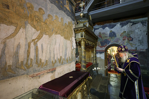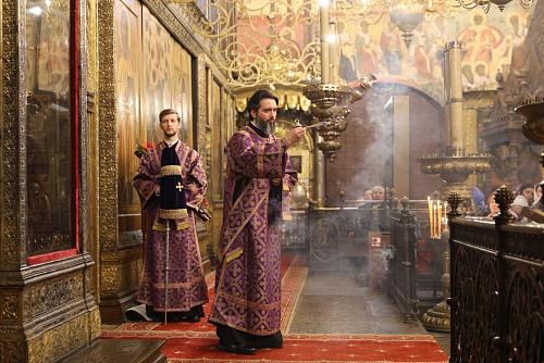 По окончании Литургии Преждеосвященных Даров митрополит Феогност совершил славление пред иконой святителя Феогноста, митрополита Киевского и всея России.