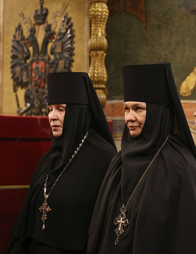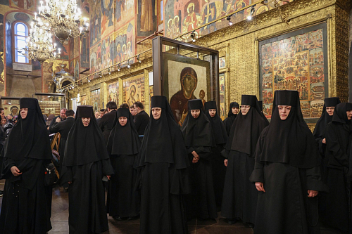 За Литургией молились заместитель председателя Синодального отдела по монастырям и монашеству, настоятельница Зачатьевского ставропигиального женского монастыря игумения Иулиания (Каледа), настоятельница Богородице-Рождественского ставропигиального женского монастыря игумения Викторина (Перминова), сестры обителей, солдаты срочной службы Президентского полка.