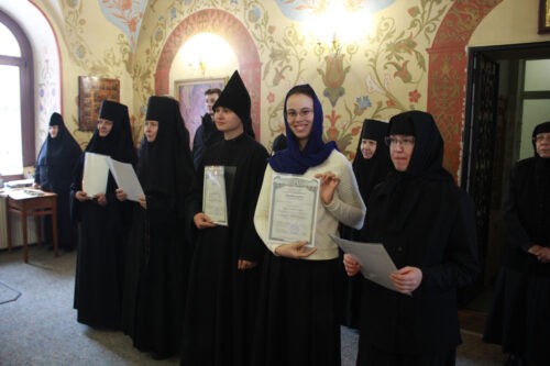 В Серафимо-Знаменском скиту монахиня Анувия (Виноградова) совместно с матушкой настоятельницей – игуменией Иннокентией (Поповой) у мощей преподобной Фамари исповедницы вручила свидетельства выпускницам. Игумения Иннокентия и монахиня Анувия поздравили выпускниц с окончанием курсов, отметив необходимость углублять полученные знания и делиться ими с другими сестрами.