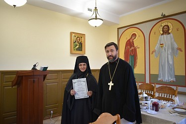 Директор Межъепархиального центра церковных специалистов Курской епархии Русской Православной Церкви, руководитель курсов базовой подготовки в области богословия для монашествующих, иерей Роман Кацап выступил перед выпускниками с приветственным словом, поблагодарил игуменов и игумений, которые помогали осуществить учебный процесс, подчеркнул значимость повышения своего образовательного уровня, поблагодарил преподавателей и учащихся за труды, после чего вручил свидетельства о прохождении курсов 44 выпускникам.