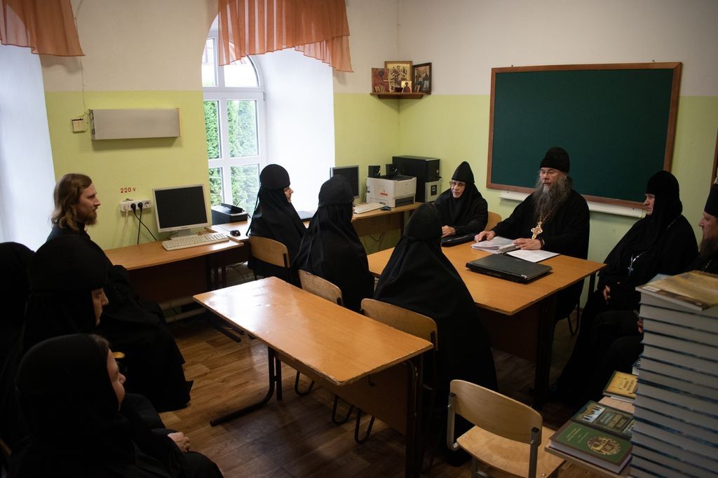 Встреча членов Комиссии с руководством курсов и преподавателями прошла на базовой учебной площадке в Спасо-Преображенском мужском монастыре Мурома. В ходе беседы были рассмотрены: учебный план, календарный график и особенности рабочих программ при изложении материала монашествующим. Члены Комиссии осмотрели учебные помещения, библиотеку и ее фонды, а также материально-техническое обеспечение, в том числе оборудование, необходимое для ведения онлайн-обучения в условиях самоизоляции.