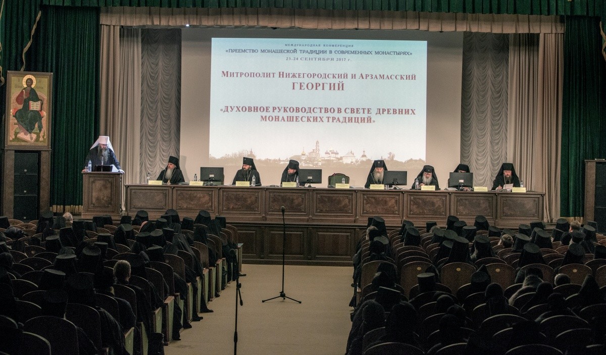 Митрополит Нижегородский и Арзамасский Георгий в докладе «Духовное руководство в свете древних монашеских традиций» напомнил собравшимся о смысле и значении Священного Предания, не только как собрания множества письменных документов, но и передачи жизни и опыта всей Церкви, вдохновляемой и ведомой Святым Духом. Духовный опыт монашеского делания является частью Священного Предания. Современному монашеству досталось богатое духовное наследство в виде аскетических творений и не прерванной традиции монашеского делания, – отметил митрополит Георгий в своем выступлении. Мудро воспользоваться этим наследством, приумножить его и неповрежденным передать монахам будущих веков – задача тех, кто подвизается ныне в ангельском образе. Возрождая монашеские традиции, необходимо воспользоваться опытом древности, оградить монашество от опасности потери живой связи с иноческим духовным наследием.