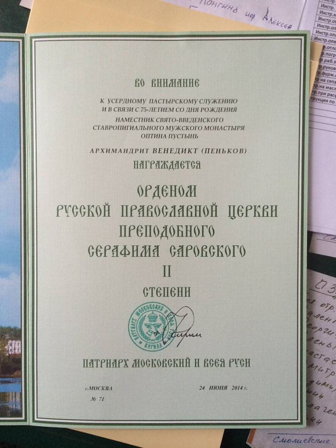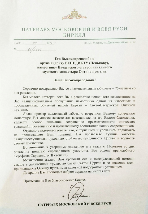 Во внимание к усердному служению и в связи с 75-летием со дня рождения полагаю справедливым удостоить Вас ордена преподобного Серафима Саровского II степени.