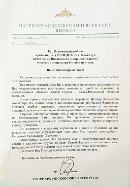 Без малого четверть века Вы с ревностью исполняете возложенное на Вас Священноначалием послушание наместника одной из известных и прославленных обителей нашей Церкви — Свято-Введенской Оптиной пустыни.