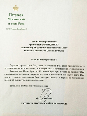 Молитвенно желаю Вам крепости сил и неоскудевающей помощи свыше в дальнейших трудах во славу Святой Церкви и во спасение всех, приходящих в Оптину пустынь за духовной поддержкой и утешением.