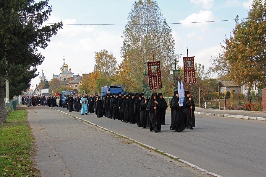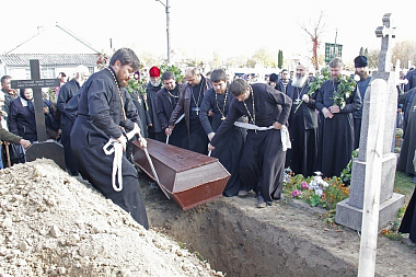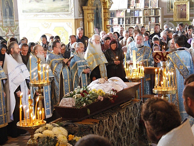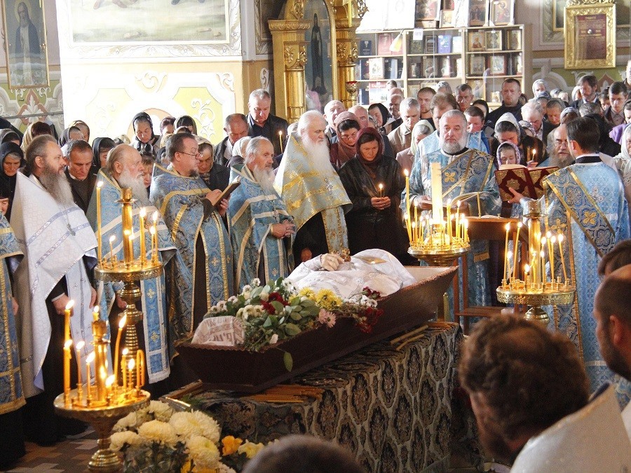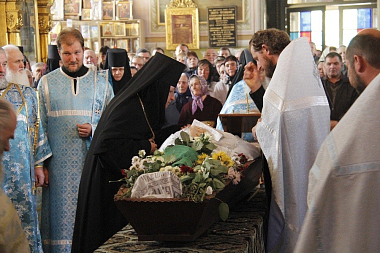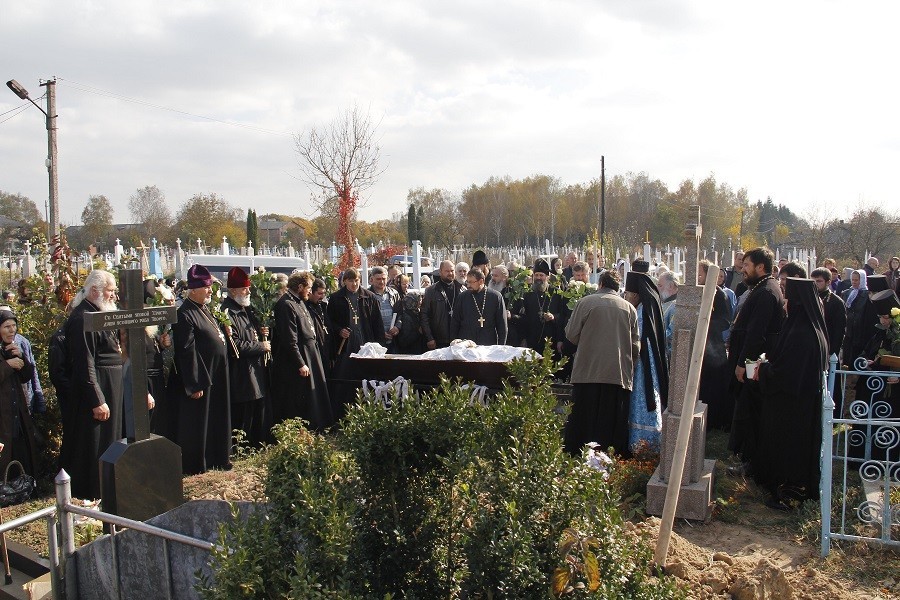 14 октября, в день праздника, утром до начала Божественной литургии насельницы обители из дому провожали гроб с телом почившего батюшки в монастырский Троицкий храм. По пришествии была отслужена панихида монастырским духовенством. По окончании Литургии и до вечернего богослужения, а также ночью священнослужители читали Евангелие. По монастырской традиции вечером сестры обители пропели 17 кафизму.