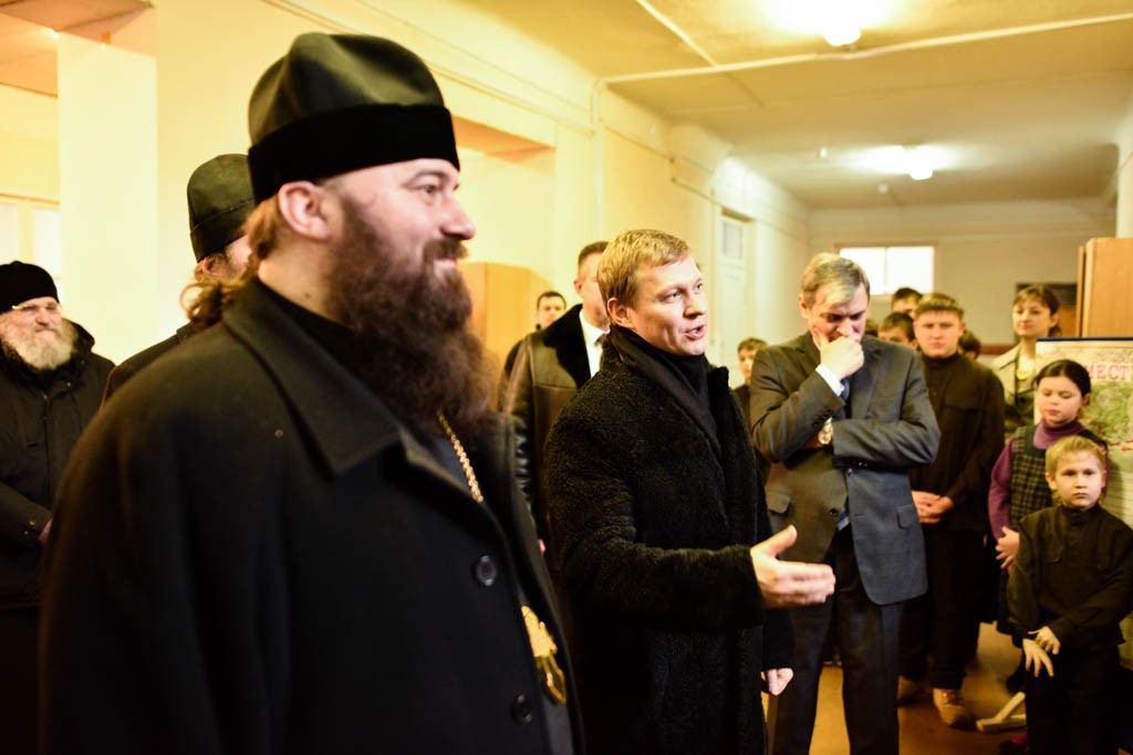 В гимназии делегацию Донского монастыря встретили и на протяжении всего дня сопровождали: Александр Григорьевич Бриж, глава Торопецкого района; Евгений Васильевич Томак, учредитель гимназии Святителя Тихона и генеральный директор Брянского камвольного комбината; протоиерей Владимир Гревцев, секретарь Ржевской и Торопецкой епархии; протоиерей Сергий Гаврышкин, благочинный города Торопца; протоиерей Георгий Фролов, настоятель Вознесенской церкви в г. Торопце, духовник гимназии Святителя Тихона; протоиерей Андрей Молотков, благочинный Торопецкого района.