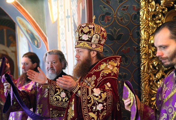Владыке сослужила братия монастыря в священном сане.