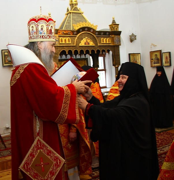 По окончании крестного хода владыка Феогност поздравил настоятельницу обители игумению Елисавету (Жегалову) с сестрами с праздником Святой Пасхи. Архиепископ Феогност и игумения Елисавета обменялись традиционными пасхальными подарками – расписными яйцами.