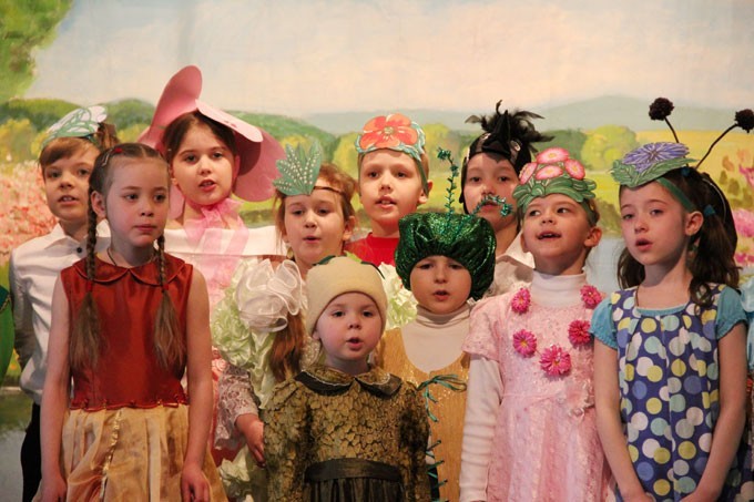 Ученики младшей группы Воскресной школы прочли стихи и исполнили песню «Милая мамочка», дети средней группы показали «Сказку о воскресшей Ромашке и Божией букашке».