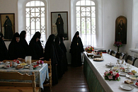 После литургии состоялась праздничная трапеза, по завершении которой владыка обратился непосредственно к сестрам и рассказал о решениях последнего Архиерейского собора.